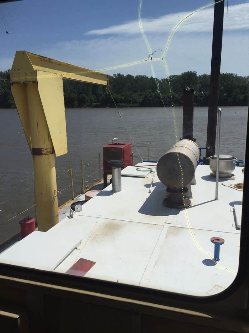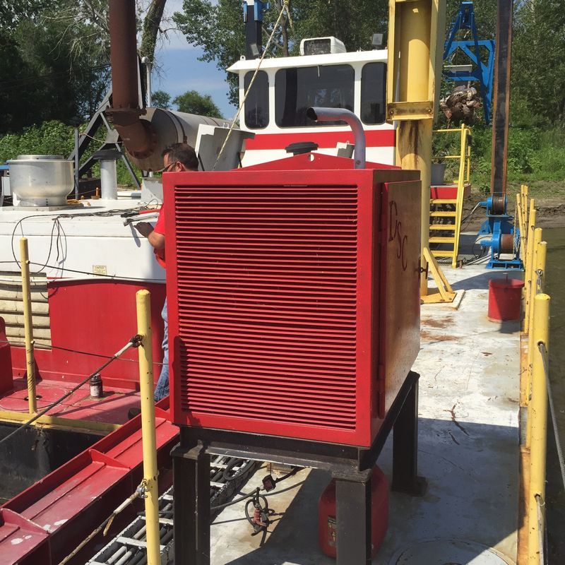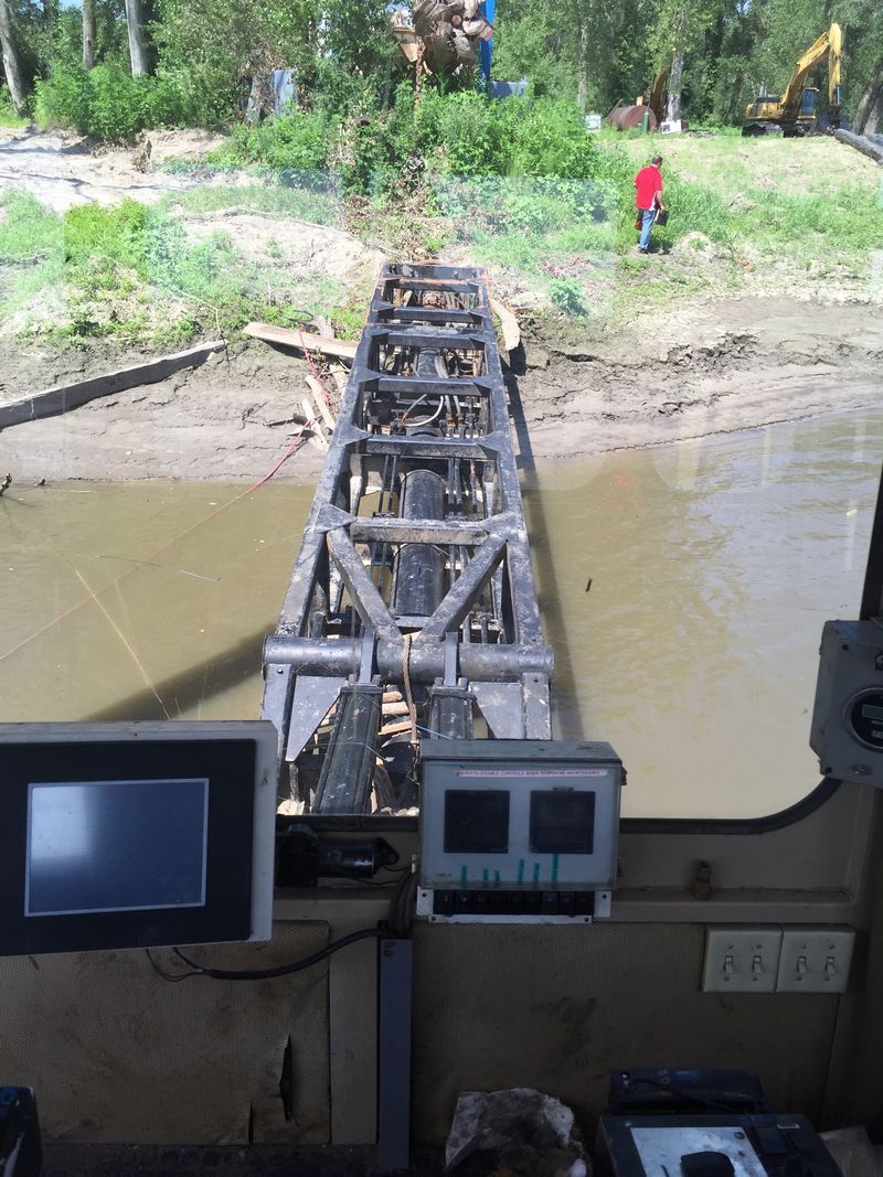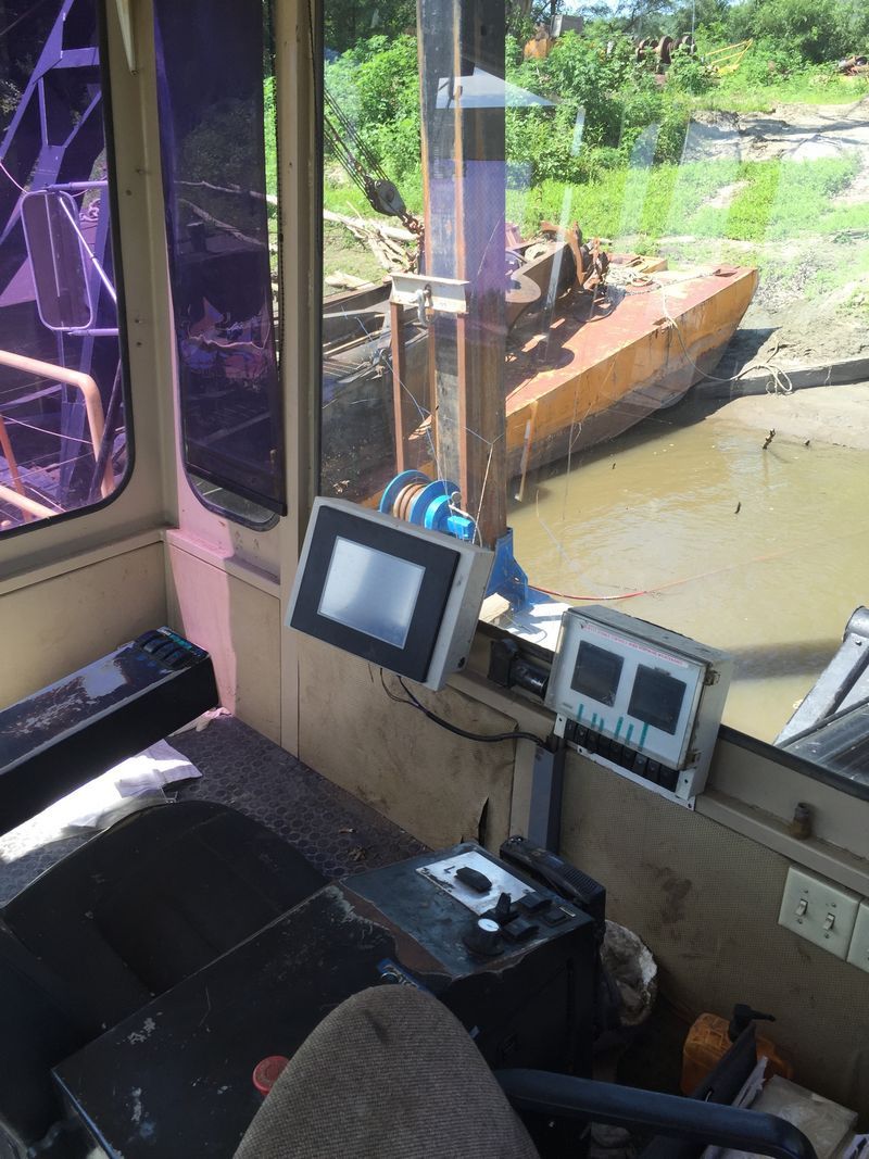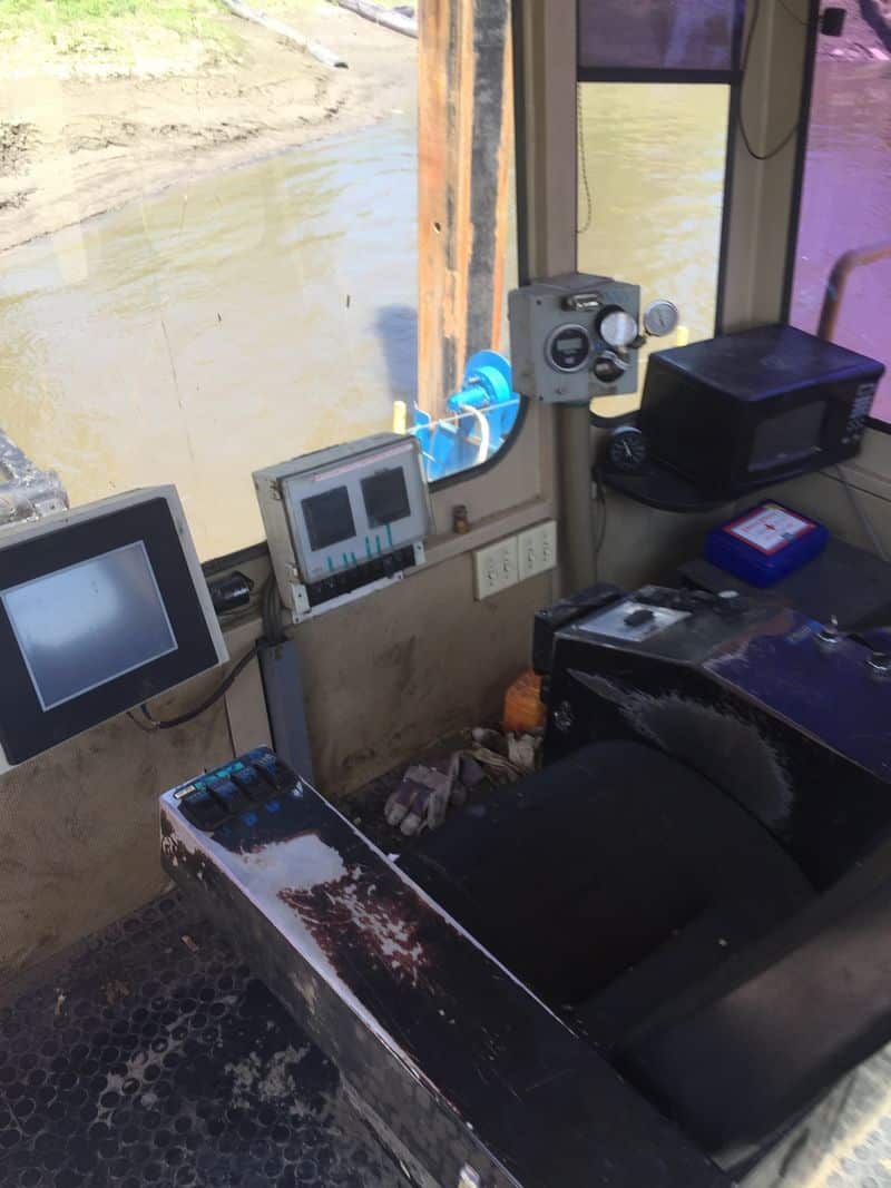 All of the dredge functions are controlled with the joystick and the toggle switches by the PLC. The joystick is mounted in the right-hand operator’s chair arm. It operates the ladder movement and conventional swinging, and has the engine speed control onthe top of it. The carriage spud, the carriage, and the two front spuds are controlled with the toggle switches in the left-hand of the operator’s chair. The touch screen displays the hydraulic pressure for the ladder functions, the spud functions, and cutter functions along with the carriage position, ladder depth, engine speed, discharge flow, production and the status of the “MAXIMIZER” valve on the main screen.